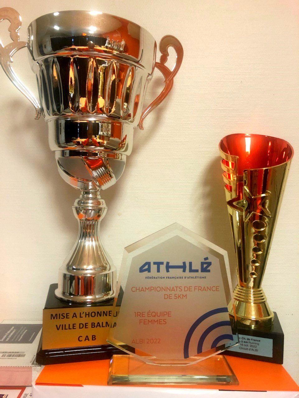 Au centre, le trophée de verre des Championnes de France Seniors Féminines sur 5Km route, remporté dimanche à Albi.