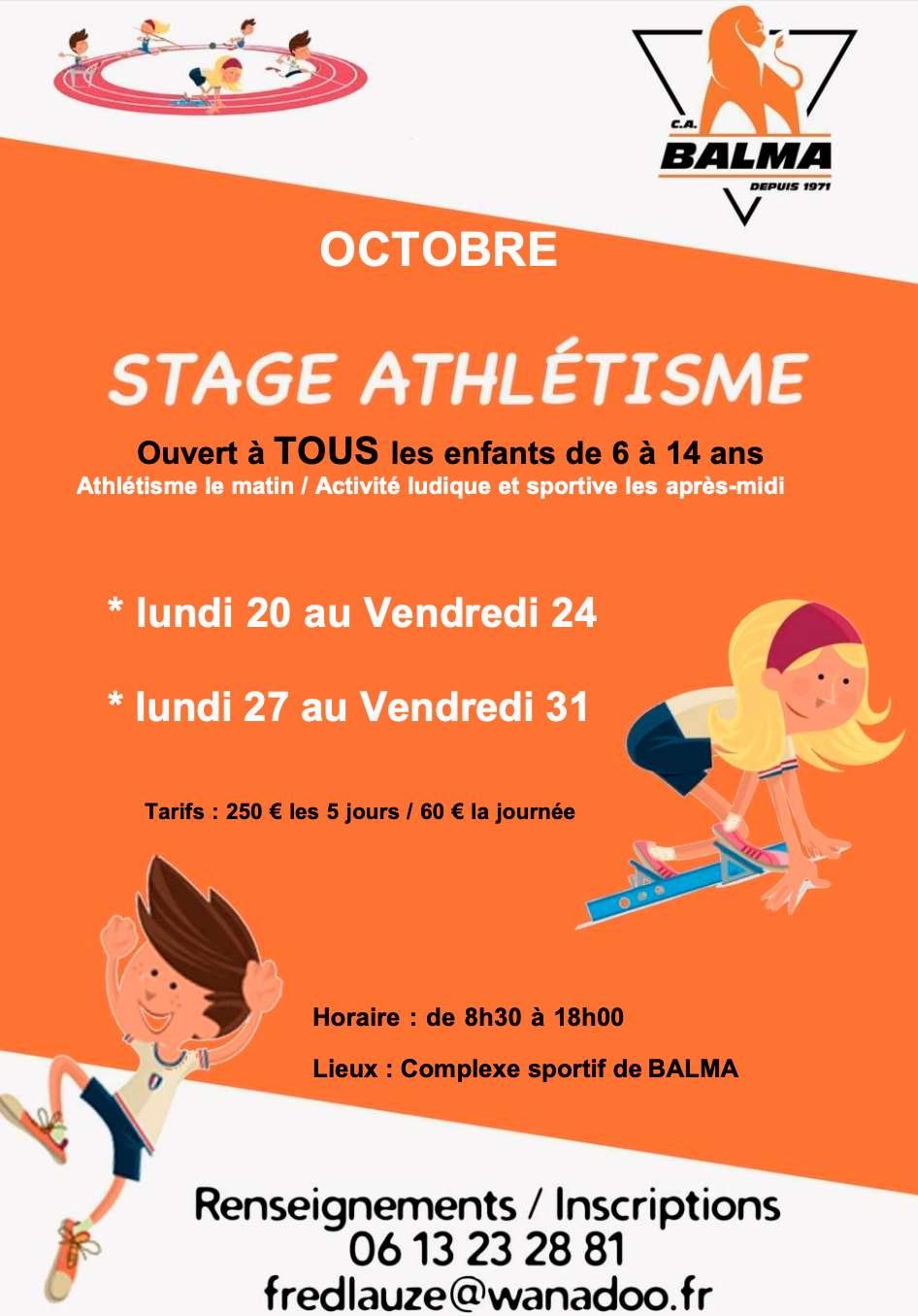 Le CA Balma propose deux nouveaux stages d'athlétisme pour les enfants de 6 à 14 ans pendant les vacances de la Toussaint. Ces stages se dérouleront du lundi 20 octobre au vendredi 24 octobre et du lundi 27 octobre au vendredi 31 octobre au complexe municipal "Nicolas Campailla" à Balma . C'est l'occasion pour les plus jeunes de découvrir les disciplines de l'athlétisme , le matin, et de participer, l'après-midi, à des activités et sorties ludiques (planning disponible ci-dessous). Horaires : De 8h30 à 18h chaque jour. Lieu : Complexe municipal "Nicolas Campailla" , Avenue des Aérostiers, 31130 Balma Tarifs : 250€ pour 5 jours 60€ par jour Les tarifs incluent le repas du midi, servi au lycée Saliège (3 Rue Georges Bernanos, 31130 Balma). Documents à fournir : - Une photocopie d’une licence sportive ou un certificat médical - La feuille de renseignement ICI - L’autorisation parentale ICI Planning : voir en bas de cet article Inscription : Merci de retourner les documents complétés et le règlement (à l’ordre du CA Balma) à l'adresse suivante : M. Frédérick Lauze 41 rue Edouard Lartet, Bat D, Appartement 18, 31500 Toulouse Si vous avez des questions, n'hésitez pas à contacter Frédérick LAUZE au 06 13 23 28 81