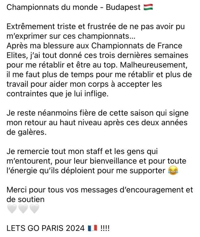 Notre championne revient sur les événements qui ont généré son abandon