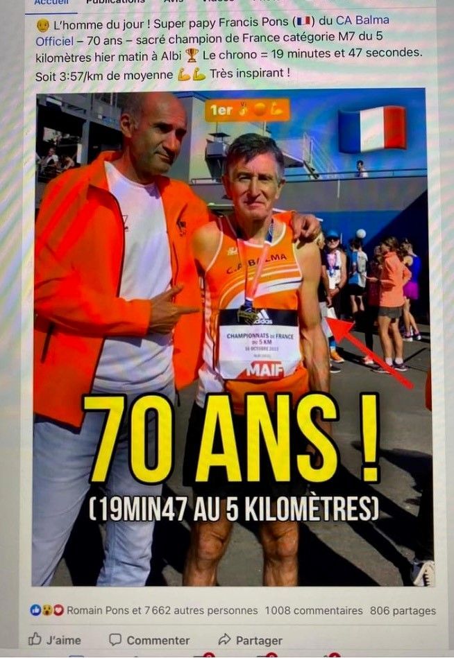 En devenant Champion de France du 5km, l'an passé à Albi, Francis PONS avait également établi le Record de France de sa catégorie.