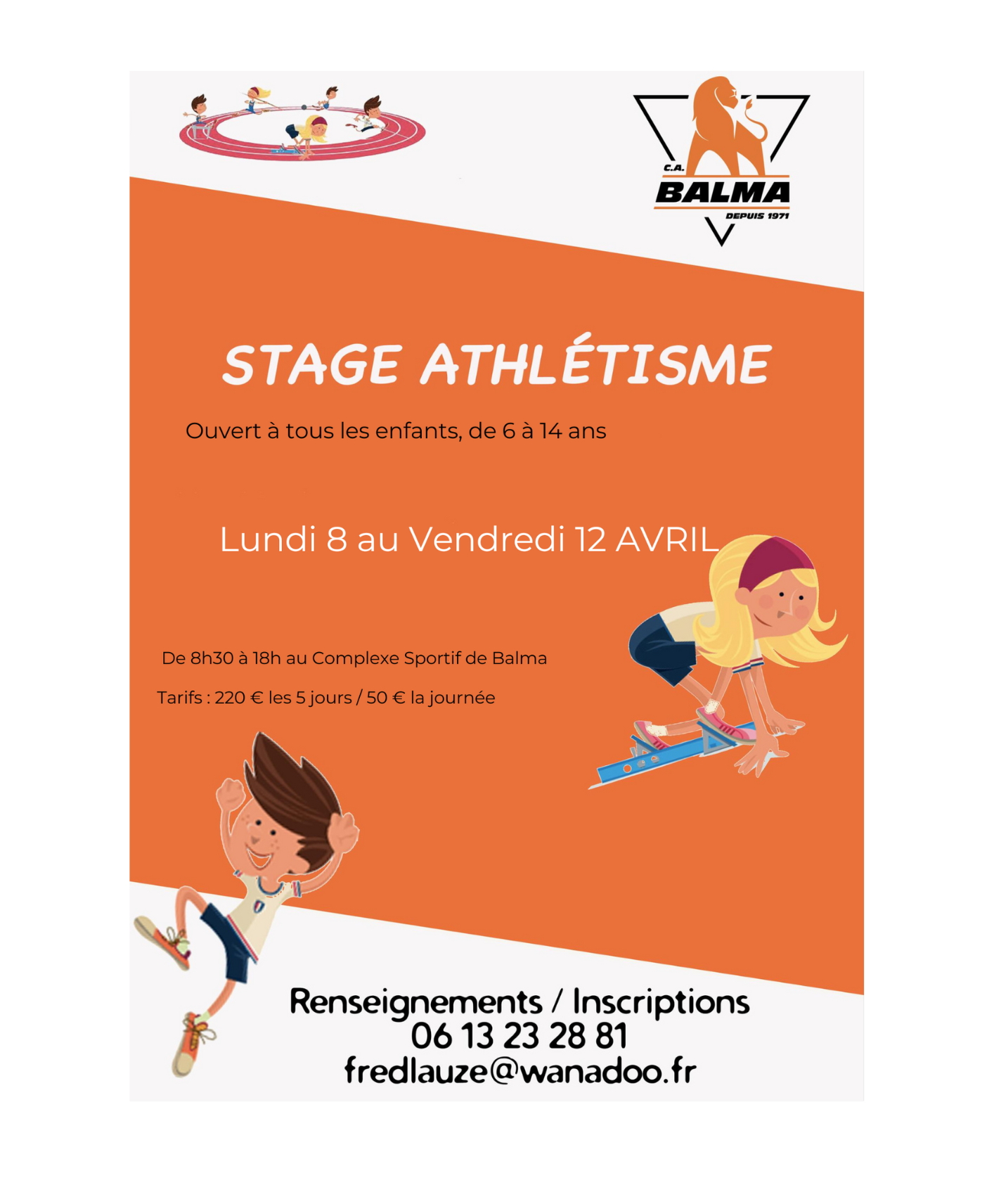 Ce stage d'athlétisme est destiné aux enfants de 6 à 14 ans, adhérents du CA BALMA ou extérieurs au club.